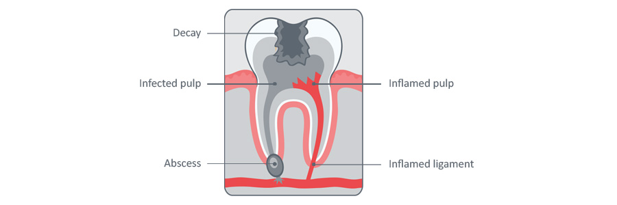 Teeth are composed of 3 layers – the outermost one is the hard enamel, followed by a softer layer below, and then a soft centre called the ‘pulp’ which has the nerves and blood vessels. When decay wears through the harder outer layers and reaches the pulp, it comes in contact with the exposed nerves, thus causing pain. The pulp can also get inflamed or infected, and you may need to undergo a root canal procedure to remove it. This is why it is important to visit the dentist if you have dental pain for more than two days. The longer you take to see the dentist, the more the infection will spread inside the tooth and gums.